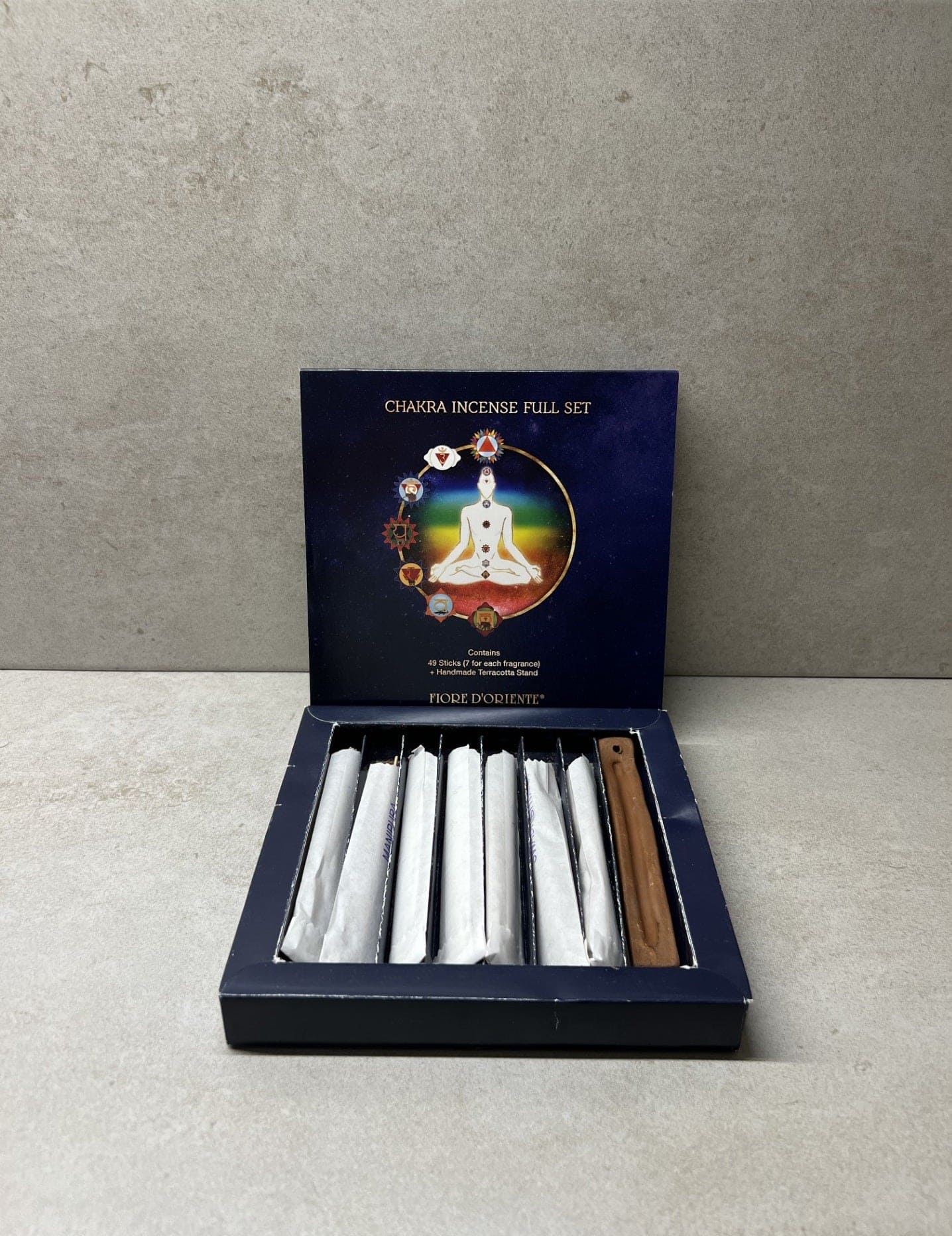Set de descubrimiento de incienso con todos los diferentes chakras que vienen en una elegante caja. Total de 49 varillas (7 de cada aroma de chakra). También incluye un portainciensos de terracota.